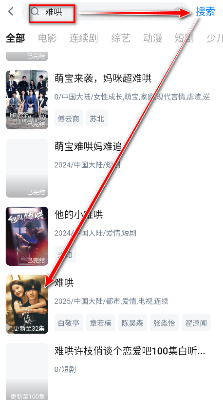 2.在这里小编以电视剧难哄为例,在搜索框输入难哄,点击搜索,再点击相对应的剧。