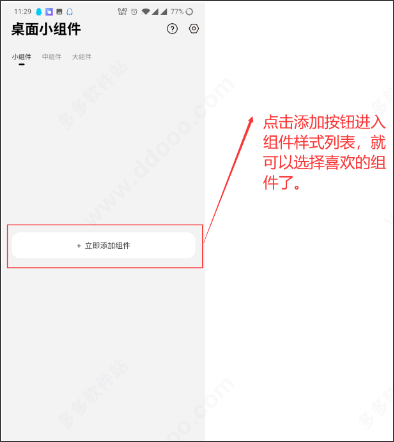 1、首先进入app主程序,点击添加组件按钮。目前组件可以选择小组件、中组件、大组件三种尺寸。