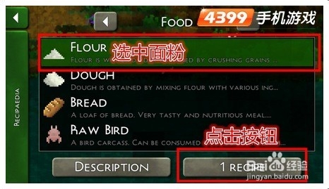 点击绿色按钮后,就显示游戏中的各种物品,随便选中一个物品(这里以面粉为例),点击右下的按钮(有些物品不需要合成是自然长成的,此按钮就不能点)就能显示出该物品的详细合成表