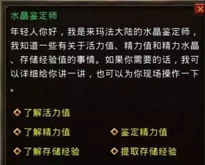 当玩家消耗完所有的活力值和精力值时,打怪只获得基础经验,并以储存的方式作为存储经验值。(英雄获取怪物经验的一般)玩家可以消耗精力值来提取对应数量的存储经验