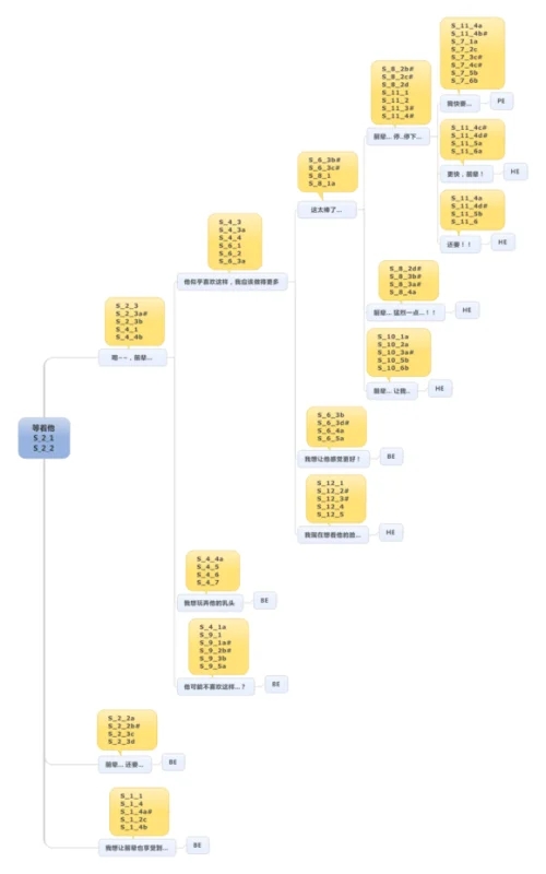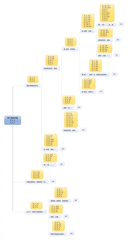 路线CG,这里是收集CG的关键,因为不同路线所开的CG也不同。我把全路线每个选项所对应可以开的CG均标注出来。因为路线中,选项的顺序是随机的,所以我以选项内容写路线图。路线图中也包括各种结局的走法。关于图中CG名字不同,那就代表着不同的CG。图中名字加“#”的CG是带有部分动态模糊效果的CG。