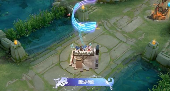 最后就是周瑜新情侣皮肤的回城特效了,在回城特效上也是满满的情意,当周瑜回城时,一台钢琴出现,小乔从旁边走回来,周瑜弹着钢琴,小乔在旁边看着,大家看看这样的情景是不是特别浪漫,一下子就有浪漫动画的氛围,同时随着时间快到结束的时候,周瑜也会在彩色的音波包围下回到城里。