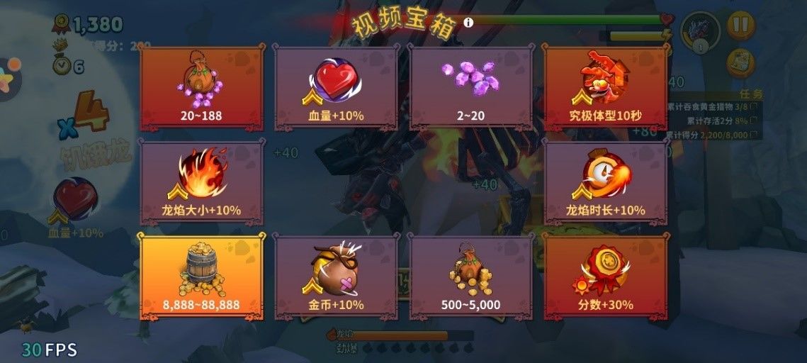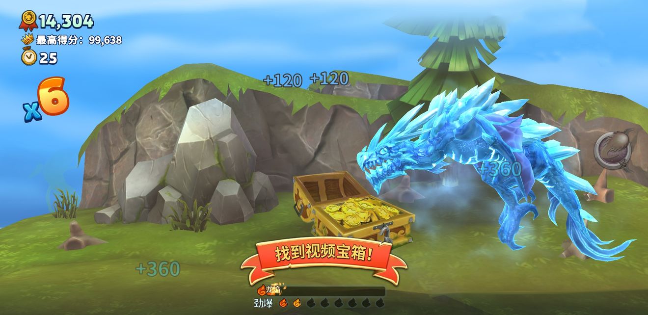 视频宝箱可以获得多种增益效果:血量加成、体型加成、龙焰时长加成、龙焰大小加成、金币加成、分数加成,但视频宝箱中所获得的增益效果仅限当局有效哦!不过如果玩家在当天其他局游戏中抽到相同增益效果,该增益属性会自动升级,最高可提升至四级,想知道驾驭获得最高级增益的龙是怎样的体验那就赶紧打开游戏寻找视频宝箱吧!