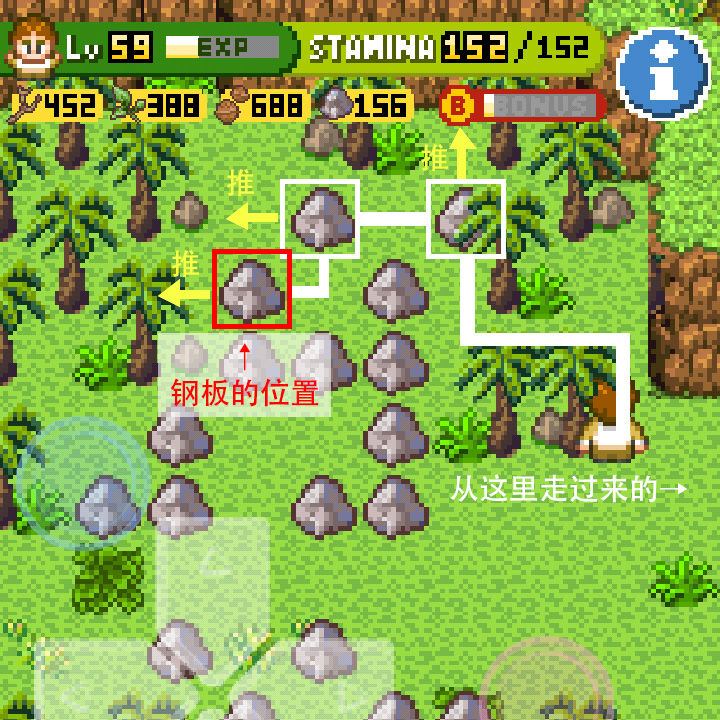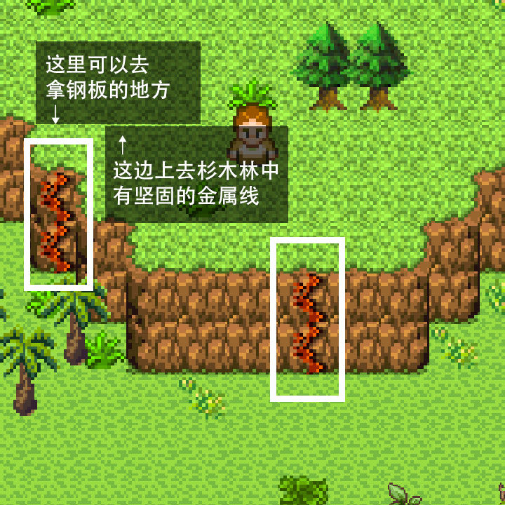 1.两棵树中间有个坑的地图里有块大石头,打它有几率让它移动一步,可以看作一个推箱子的小游戏,把它打到坑里就能过去了。