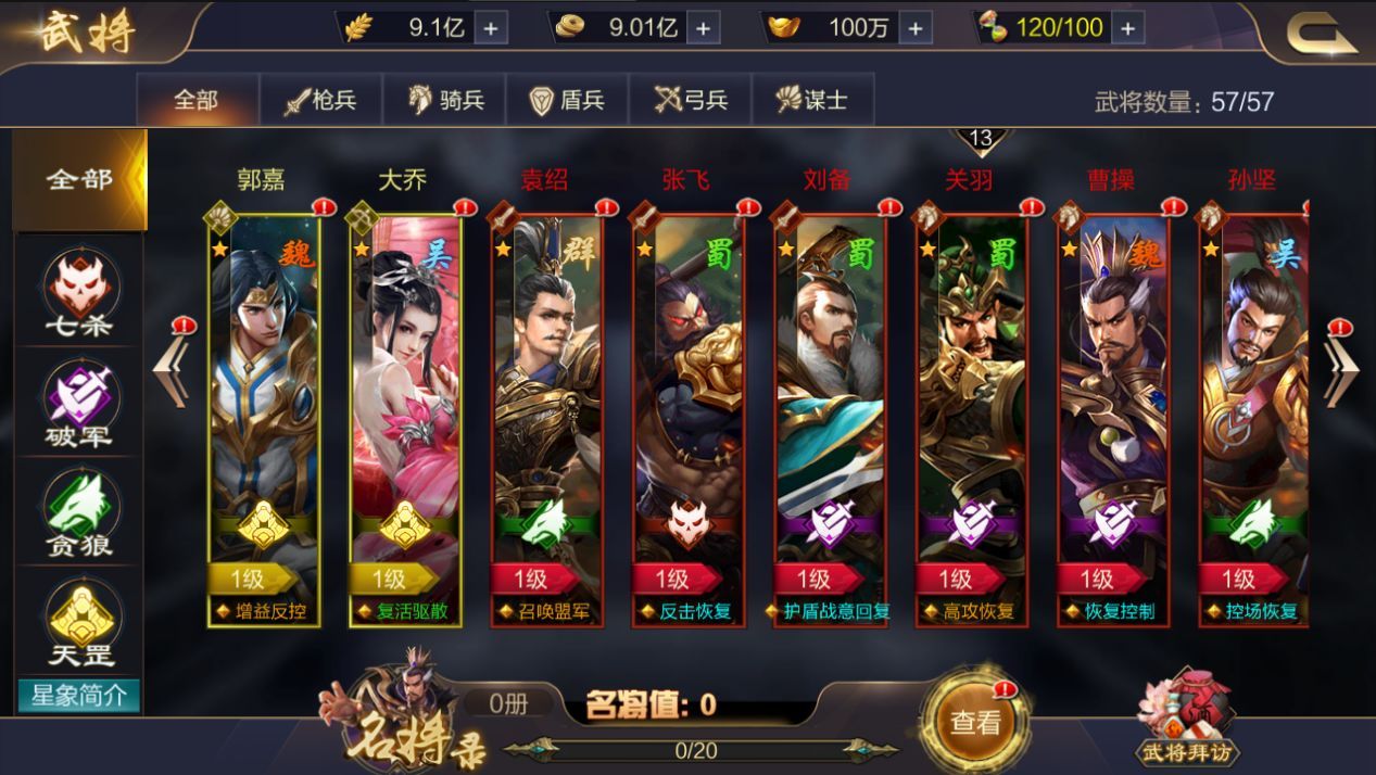 ①武将分为:七杀、破军、贪狼、天罡;又分为:骑兵、枪兵、盾兵、弓兵、谋士;还分为:魏、蜀、吴、群阵营。