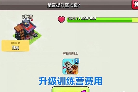 升级15级训练营需要11天的时间,升级费用6百万圣水,训练营生命值提升100点。
