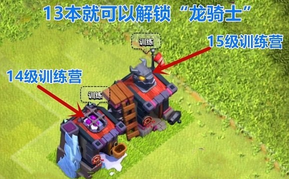 这就是14级和15级训练营的对比图,我们可以清楚地看到,14级训练营的屋顶是“小雪怪”而15级训练营的屋顶就变成了“龙头”也就是说13本的小伙伴在更新以后,就可以把“训练营”升至15级解锁“龙骑士”了。