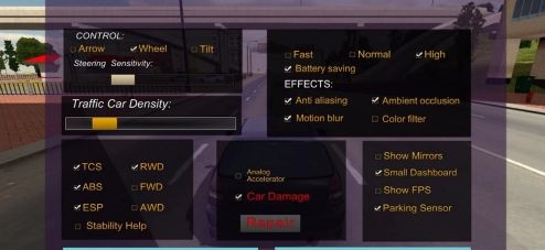 点击游戏界面右上角的设置按钮,这里的自定义项相比前面那个更多且更加细致。在左上方我们可以调整驾驶灵敏度和游戏中的车流密集度,左小右大。对于新手玩家,小编建议大家可以适当调低驾驶灵敏度,降低车流的密度。灵敏度的下降便于新手玩家们更好地控制车辆,更少的车辆也会使游戏玩起来避免了不断地碰撞从而更加流畅~