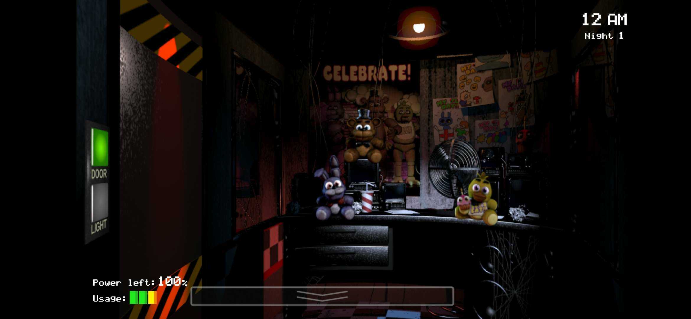 每局游戏开始时都会有一百的电量。开灯、打开监控、关门都会增加耗电速率(在Usage一栏,格子越多耗电越快)。同时你什么也不做也会耗电(看到那台风扇和那盏灯了吗)。当电量归零时,屏幕暗下去,两侧门打开,隔一段时间熊就会来跳杀你(第一夜没有熊也会跳吓,我曾经以为第一夜熊不会跳吓,然后被吓得差点砸烂电脑屏幕)。