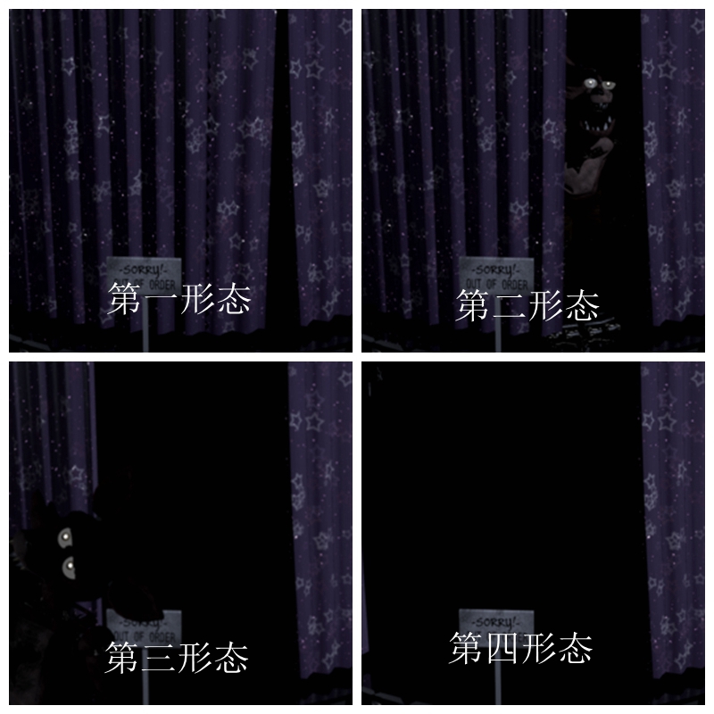 狐狸(霍斯):会在监控窗帘那里 需要看监控控制他的行动 如果你不开监控看他 他会慢慢的出来 当你发现监控里窗帘被拉开狐狸不在里面 请迅速关上左门 他会以百米冲刺(其实不会很快)的速度奔向你的左门 撞三下并且会偷取你的一些电量(应该是我没仔细看)