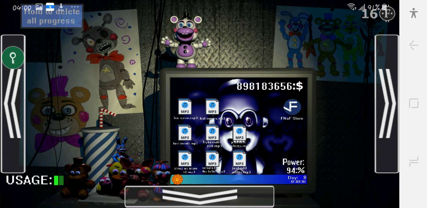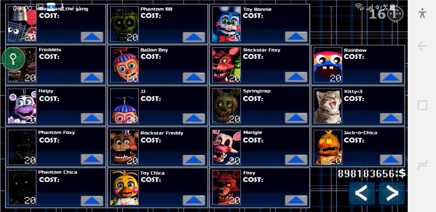 玩偶列表:曼果(不能骗走但能不让其进攻)、老奇卡、弹簧、融化弗莱迪、安纳德等玩偶。