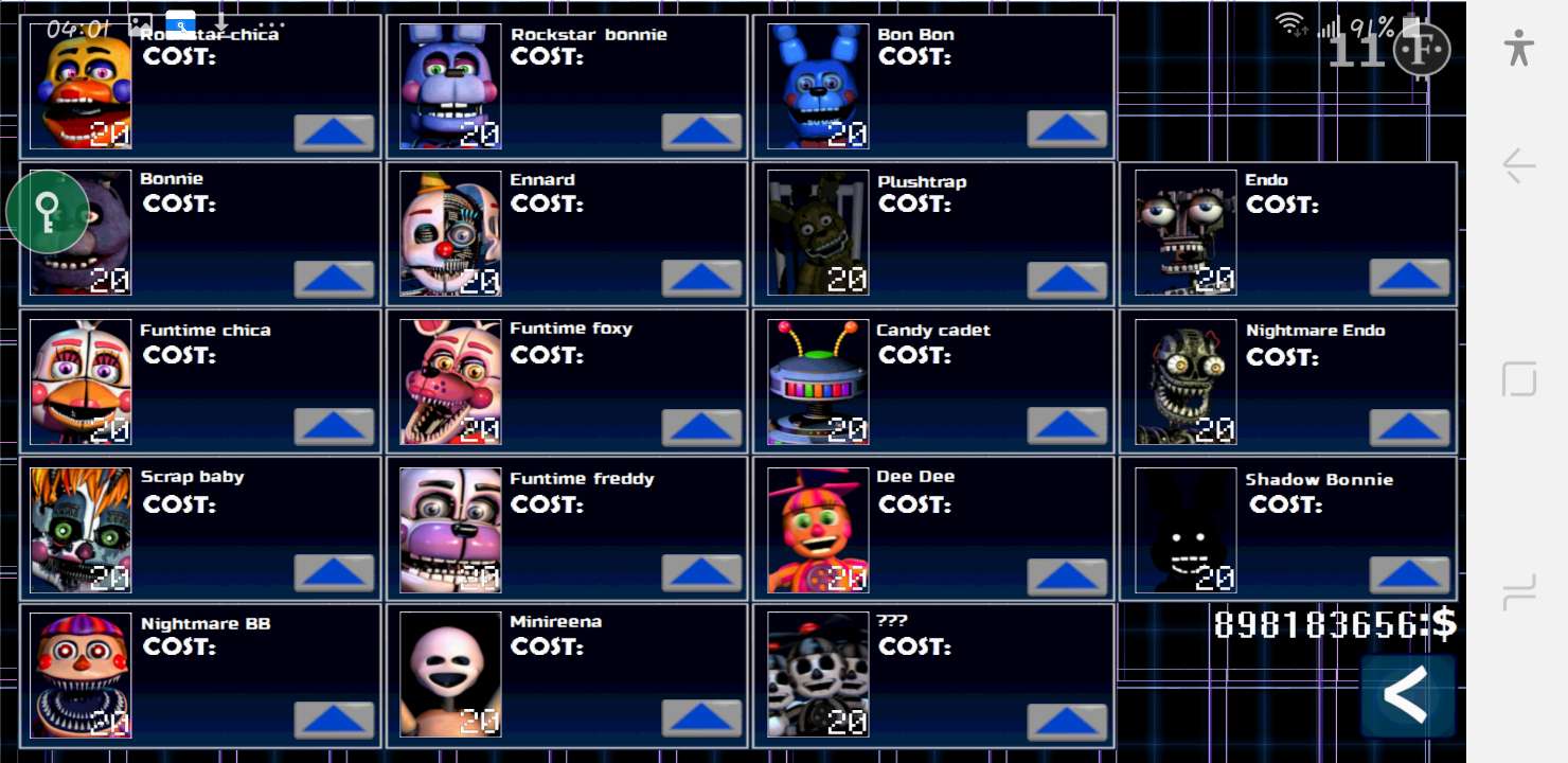 弗莱迪、邦尼、奇卡、霍斯、玩具弗莱迪、玩具邦尼、玩具奇卡、曼果、气球男孩、DD、破旧邦尼、破旧奇卡、小丑、黄金弗莱迪、弹簧陷阱、幻影曼果、幻影弗莱迪、幻影气球男孩、梦魇弗莱迪、梦魇弗莱迪缩小版、梦魇邦尼、梦魇黄金熊、梦魇、万圣节奇卡、梦魇曼果、梦魇小丑、梦魇气球男孩、钓鱼的老人、baby、芭蕾拉、欢乐时光霍斯、埃纳德、三个垃圾玩具组合、欢乐时光小弗莱迪、青蛙、河马、猪、熊、大象、摇滚弗莱迪、摇滚邦尼、摇滚奇卡、摇滚霍斯、音乐人、墨西哥弗莱迪、欢乐时光奇卡、熔熊、残缺baby、残缺弹簧、小左、电话男、迷你瑞娜、暗影邦尼、虚拟霍斯、邦尼特、毛绒陷阱、梦魇奇卡、幻影DD。