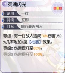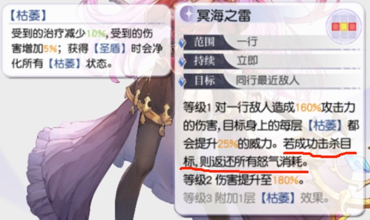 雷的奥义攻击力其实并不强(和SSR相比)。关键是“击杀成功返还所有怒气消耗”,也就是每次只要有击杀,就可以永远放下,所以出现前五名。复出的场景。另外,“目标身上每层【枯萎】都会增加25%的威力”,所以只要在目标身上堆积足够多的【枯萎】,击杀难度就会大大降低。
