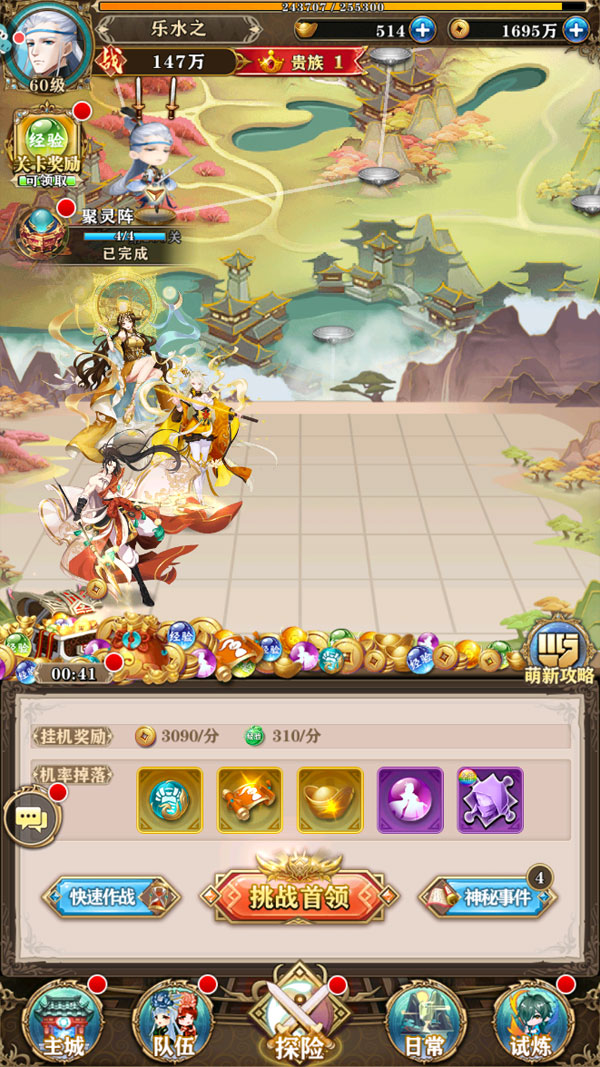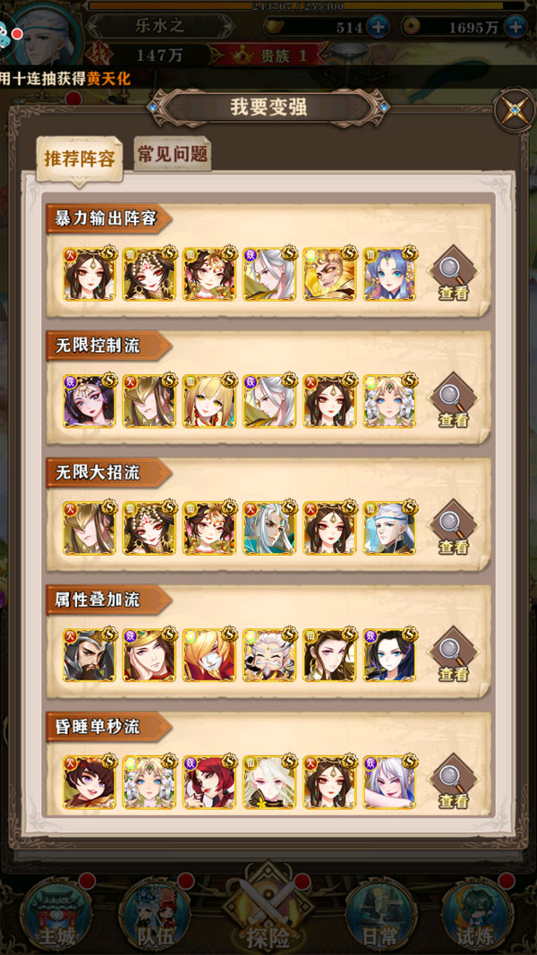说完阵营搭配之后。樱霞,接下来要为您讲一下,神将个人定位的具体搭配。这里樱霞我总结了一部分的神将搭配定位。大人,您可以参考一下,在探险界面,点击萌新攻略就能打开观看啦!