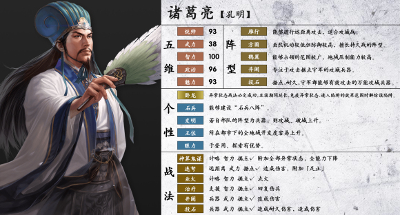 每个武将都有自己所掌握的一到数种阵型,且无法学习新的阵型,这意味着哪怕再强悍的武将也不是万能的,实际上是以阵型搭配取代了三国志11的兵种搭配。(阵型并不新鲜,至少在三国志9已经有了)一些高统率的文官有了冲锋在前的价值,比方说贾诩可以指挥主打防守的方圆阵。