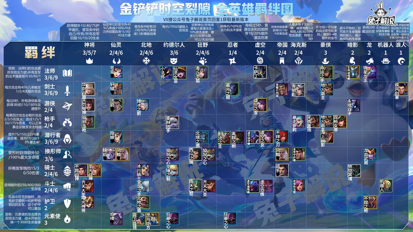 当你找不到自己想要的棋子的时候可以看这一张图,也帮助大家快速的认识头像与棋子的名字,你也可以尝试通过羁绊的组合设计出自己喜欢的阵容,阵容的强大主要是基于羁绊和棋子的数据来进行设计,更好的了解各个羁绊的具体属性也会让你对这款游戏有着更深的理解。