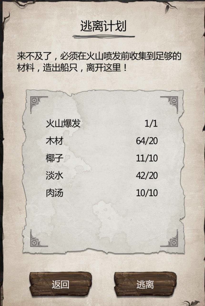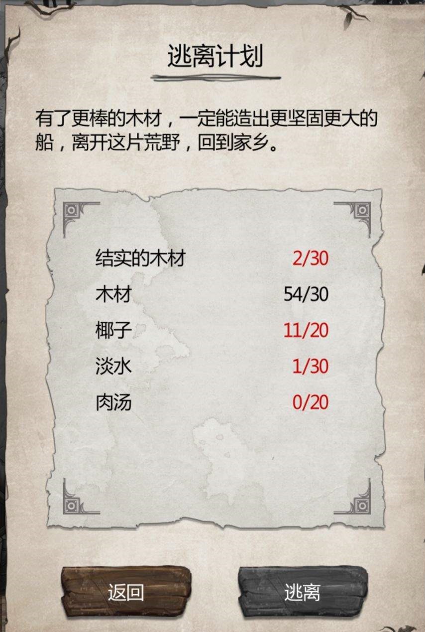 逃生需要准备资源:20个木材,10个椰子,20个淡水,10个肉汤。