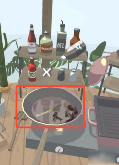 第三步:点击食材它们就会落在菜板上,点击刀具并对准食材就可以完成切菜动作。烹饪的流程也是如此,点击可以开火或者关火。