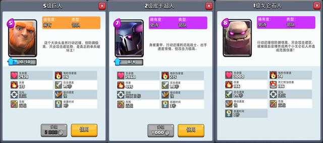 巨人、骷髅巨人、皮卡超人第二梯队费用5、6、7,但是后面两款是史诗紫卡,特别难升级,所以前期还是巨人较有优势。