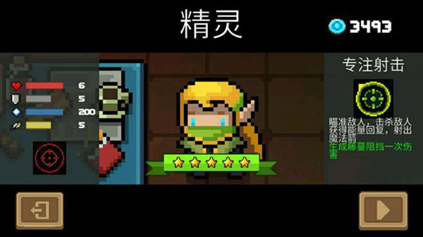 技能——专注射击:瞄准敌人,击杀敌人获得能量回复,射出魔法箭。升满星后生成藤蔓阻挡一次伤害。