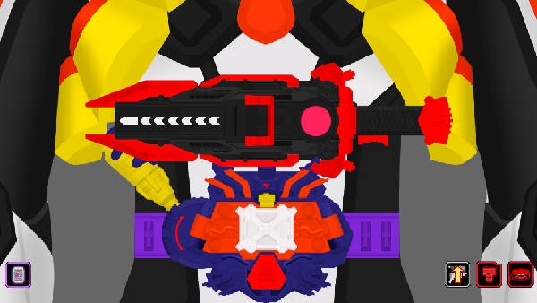 4、这个骑士是用腰带枪变身的,首先点击第一个按钮,组装手枪,点击第二个按钮进入变身的白热化阶段,这时扣动扳机。