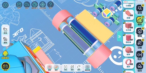 通过【旋转】和【缩放】,将“扇形圆台”搭建出大圆柱的两端,接着在中间填充四个“圆柱”,并令每个“圆柱”与其对应的“扇形圆台”相互【绑定】,此时由“扇形圆台”和“圆柱”组成的大圆柱初显雏形。在大圆柱两端的中心位置各加入一个“圆柱体”作为中心轴,再将这个“圆柱体”与相邻四个“扇形圆台”绑定,并给“圆柱体”添加运动器,使其运动方式变为滚动,这样就能在圆柱保持转动的同时,大圆柱整体也能实现转动。