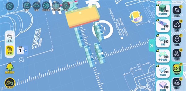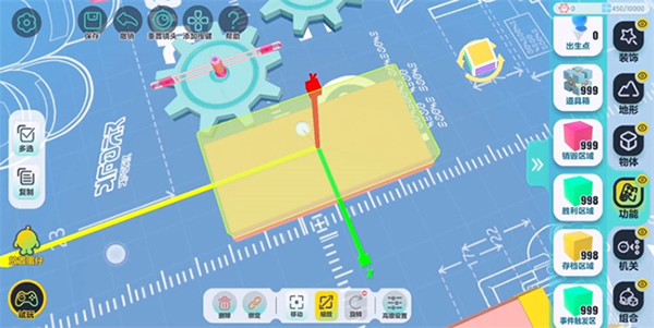 为方便操作,在正式开始搭建前,需将设置中的编辑视角更改为【上帝视角】。在机关中找到“齿轮”并拖出,即可实现“齿轮”摆放的基础操作。除了正常的摆放外,还可以点击【旋转】将“齿轮”旋转至竖起,也可以调整【缩放】调整“齿轮”大小及侧面的宽度。