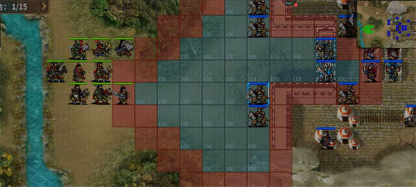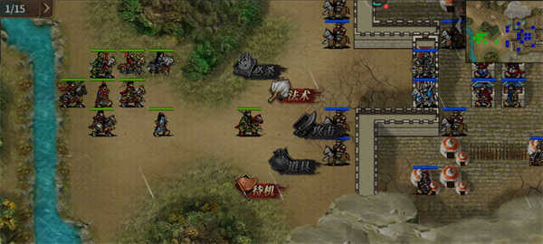 流程:开始杨靖平、杨靖轩(sl防御不掉)被敌军包围在营寨内,杨靖轩防御力增加。程军超、程斌、程晓康、王雅梅出现在左上角,程军超去下方埋伏;敌军出现在左上方拦截,程斌杀死一个敌军,程斌攻击力、防御力增加,左上方的的敌军混乱,防御力减少。