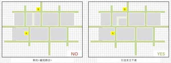 将人们引向主干道。铺设小路时,避免新的“最短路径”诞生;在添设主干道的旁支时,要时刻注意是否错误地让小路分担了主干道上的交通。