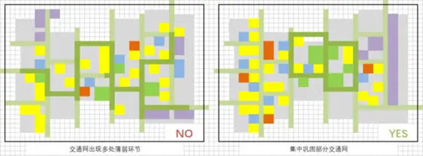 让密集的网状道路平均承担交通压力——然后集中巩固人流磁铁建筑周围的道路!