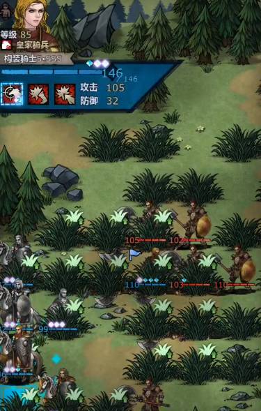 3、划重点:这个任务的地形是在一片草丛里,每次只能移动一步(注:刺客不受该地形影响,禁卫最好带个援护当工具人),懂得拉扯是其中关键,皇骑只能反击一次,有无限反击、超强招架以及孤儿斩的大剑可以考虑一带五。