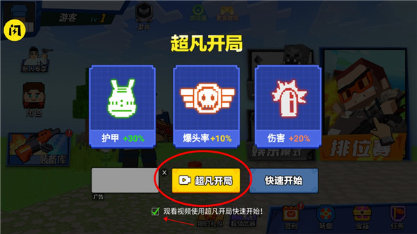 7、然后直接回到首页点击匹配,开始一局游戏吧,在这之前,我们点击超凡开局,毕竟免看广告,随便玩;
