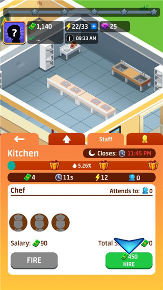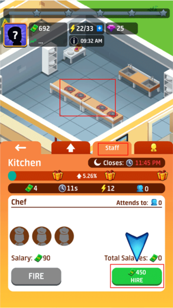 3、这时让我们雇一个厨师来厨房,快!这是一些现金。点击厨房——staff(工作人员)花费450雇佣新的厨师。