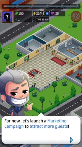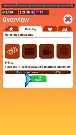 10、现在,让我们发起营销活动来吸引更多的客人!点击屏幕右下方的“灯泡”发送传单吸引更多的客人。