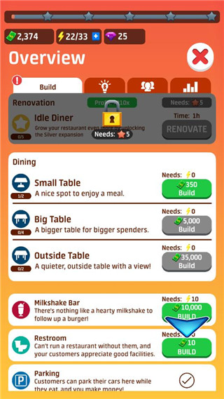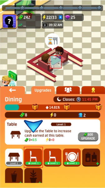 最后,用你赚的钱来升级你的餐厅,解锁更多桌子,支付员工工资,吸引更多的客人。