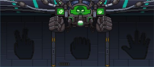 该BOSS是一个猜拳机器人,BOSS的两只手会不断地剪刀石头布变化,一定时间后,手里的变化停止,玩家需要根据BOSS手中的形状,走到赢过他的石壁位置。胜利之后,BOSS的手会从空中降下来,大家就可以进行攻击了,如:BOSS手的形状停留在剪刀,玩家需要走到画着石头形状的墙壁。