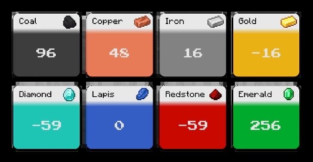 1、矿石分布:下表展示了自1.21版本“洞穴与山崖”地形重做后,各类矿石在Y轴坐标下的最佳挖掘高度。煤炭集中在96层,铜矿在48层,铁矿石位于16层,金矿石在-16层,而钻石和红石的最佳采集层均为-59层,青金石则多出现在0层,绿宝石仅在256层生成。因此,想要高效获取钻石,只需深入地下至-59层附近即可展开挖掘。