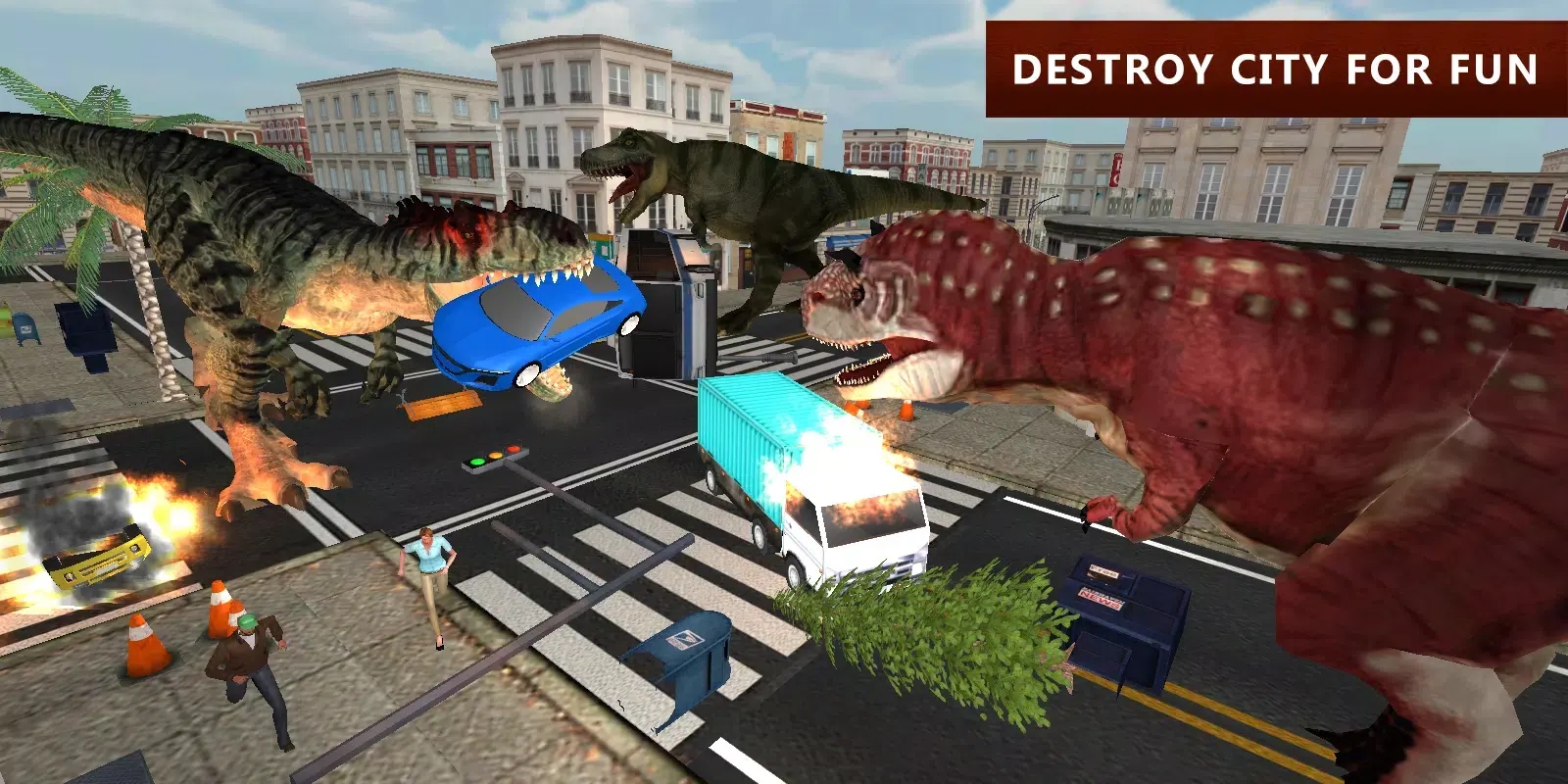 恐龙模拟器城市攻击是一款极富娱乐性的模拟游戏,玩家将操控霸气霸王龙在城市中展开疯狂冒险。摧毁建筑、车辆等目标获取积分,解锁更多恐龙种类。操作简单易上手,凭借恐龙的压倒性战力,尽情体验摧毁整座城市的破坏快感。