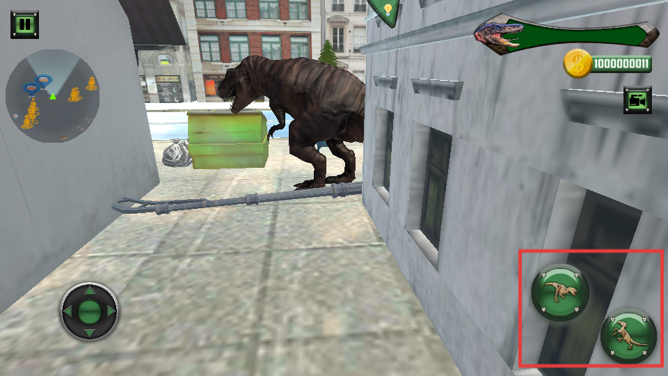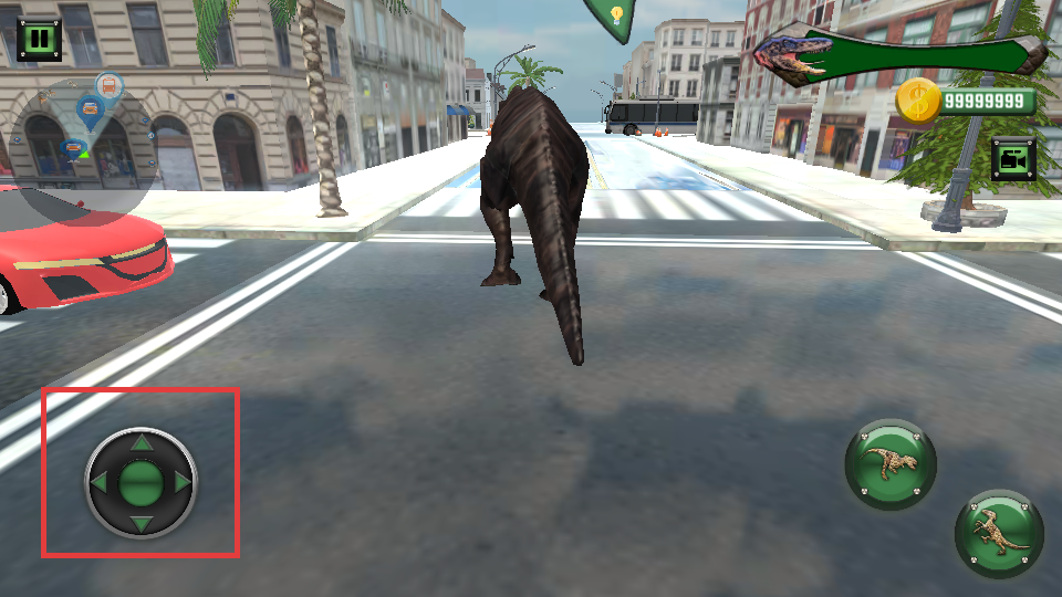 3、使用左侧虚拟摇杆控制恐龙移动,穿梭于街道、广场与高楼之间,全面探索城市场景。
