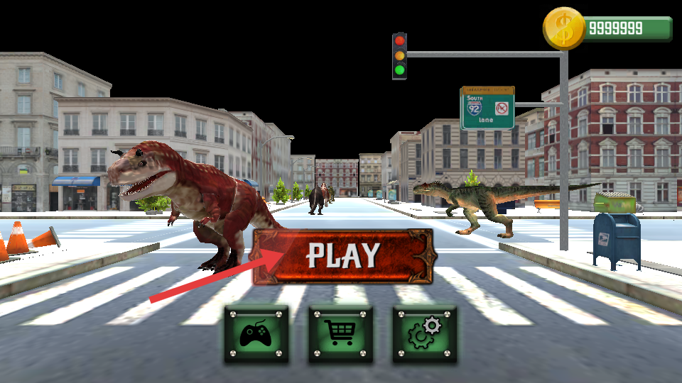 1、点击【PLAY】按钮,进入游戏主界面,正式开启你的恐龙城市破坏之旅。
