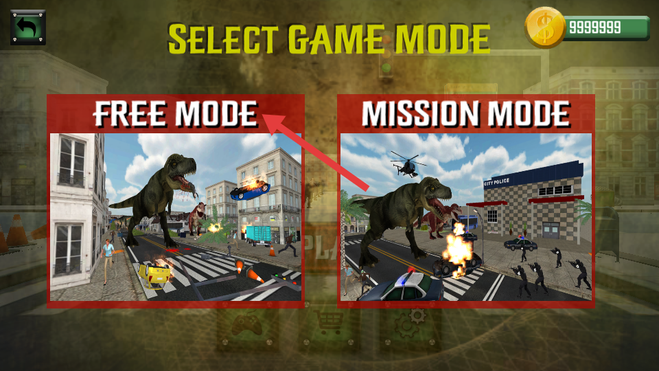 2、选择【FREE-MODE】模式,进入无限制自由破坏环节,随心所欲操控恐龙在城市中行动。