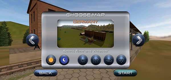3、选定火车后,选择喜欢的地图场景,还可自定义天气与时间设置;