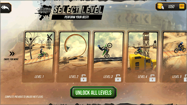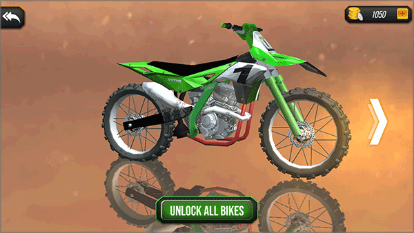 1、下载并安装欢乐摩托车特技赛手游后,进入游戏可选择一辆喜欢的摩托车开始冒险。注意,部分车辆需使用金币解锁才能使用。