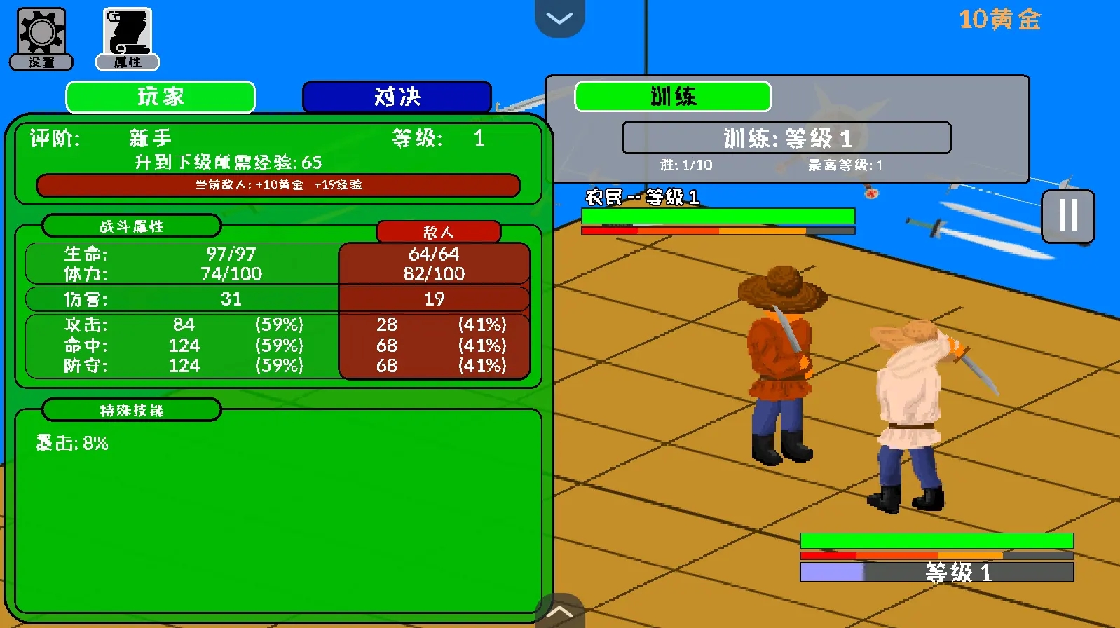 剑斗士放置是一款超简单趣味的休闲小游戏。玩家通过训练剑斗士完成各类挑战任务,体验丰富战斗场景,解锁新技能,升级强化战力。操作简单易上手,多样战斗风格任你体验,随时随地畅享精彩战斗乐趣。