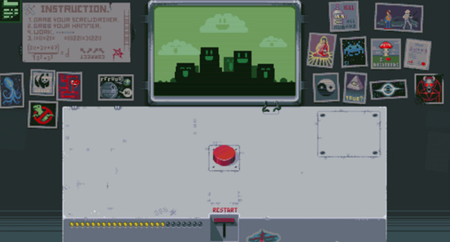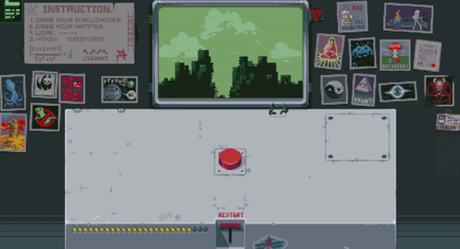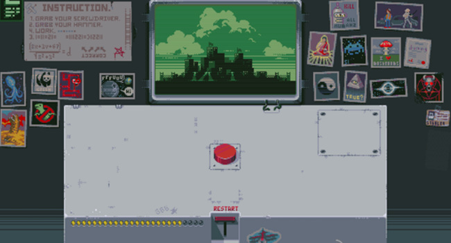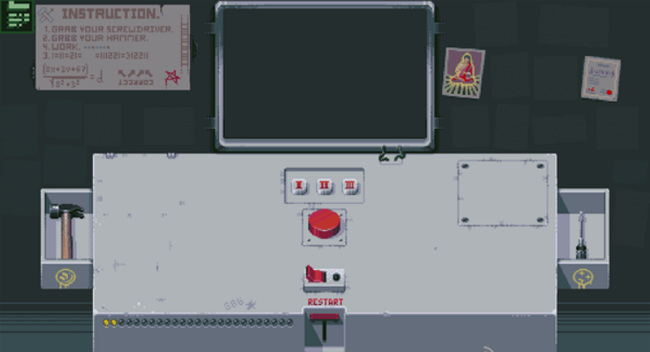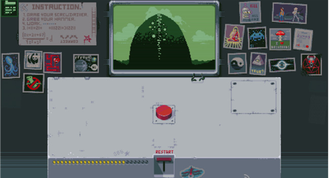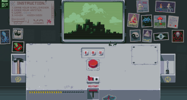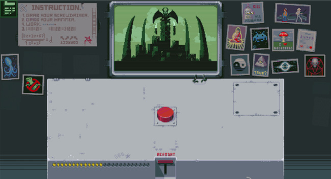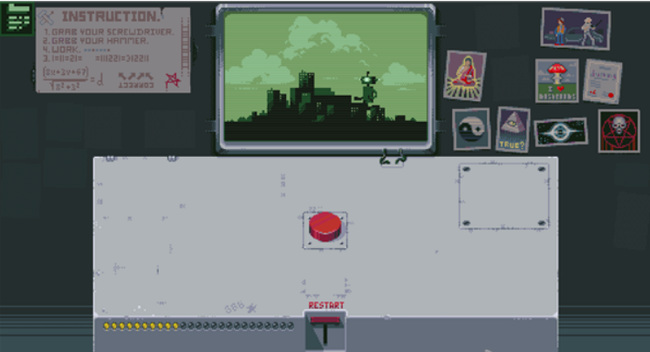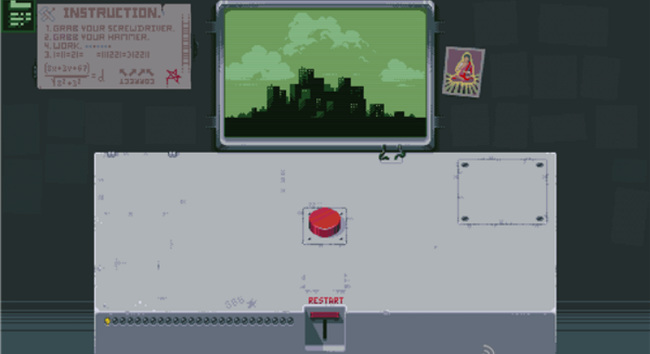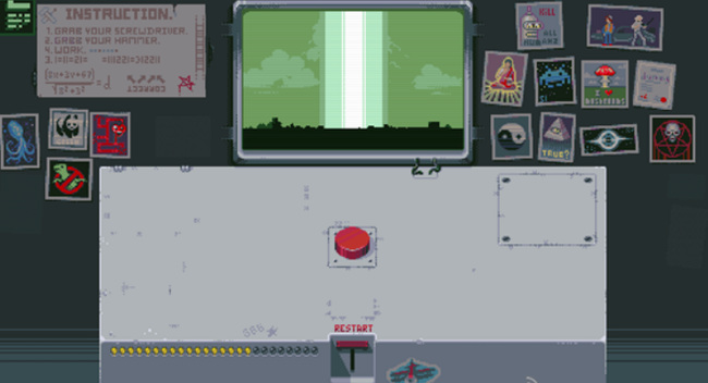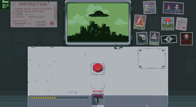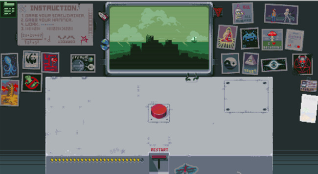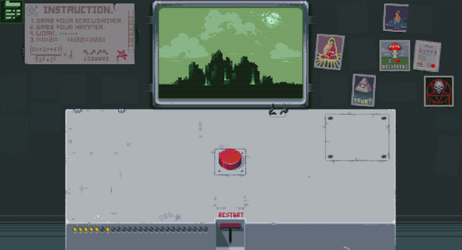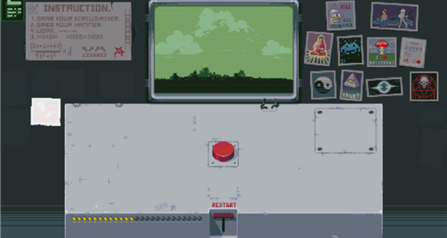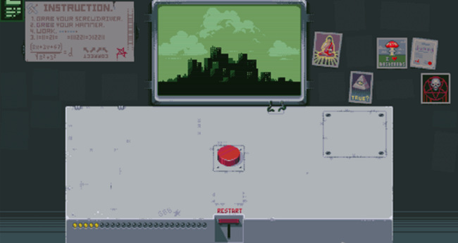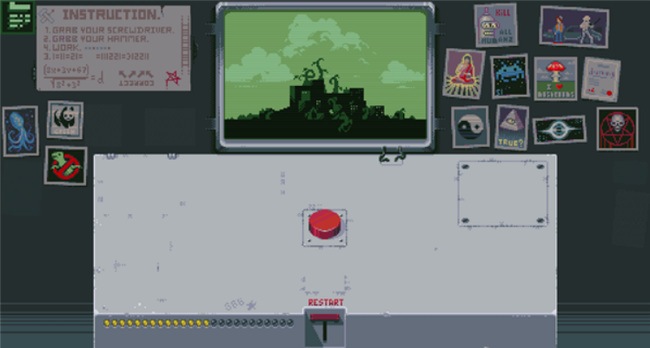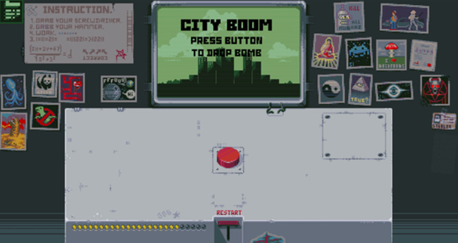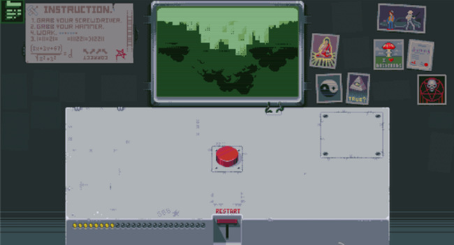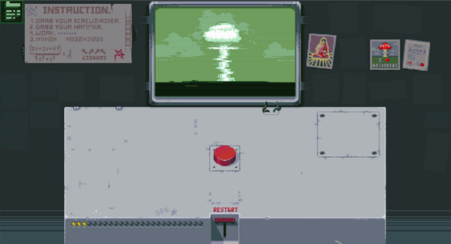 3. 第三盏灯:先点击RESTART回到初始状态,再点一次红色按钮,随后点击新出现的开关使红灯亮起。再次点击红色按钮,左侧开始倒计时,最终屏幕显示原子弹爆炸画面,第三盏灯点亮。