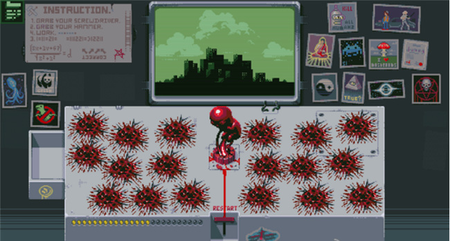 16. 第十六盏灯:点击红色按钮直至锤子出现,用锤子猛砸红色按钮。砸出红色怪物后,周围会出现红点,每个红点需砸3次。务必在怪物血液蔓延至RESTART前清除所有红点,否则游戏重置。成功清除三波后,第十六盏灯点亮。