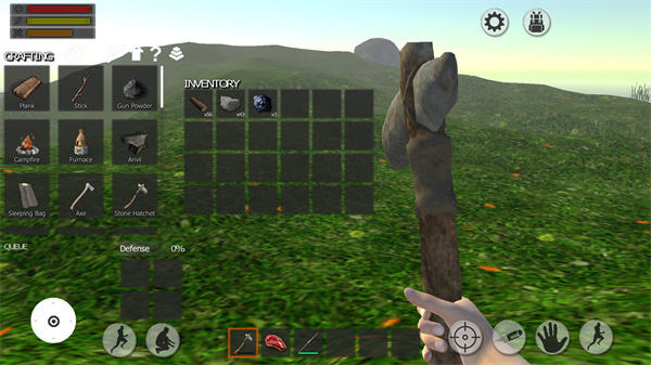 5、点击背包按钮可打开合成界面,利用收集到的木材、石头、兽皮等材料制作更高级的工具与装备,合理创造将极大提升你的生存效率。