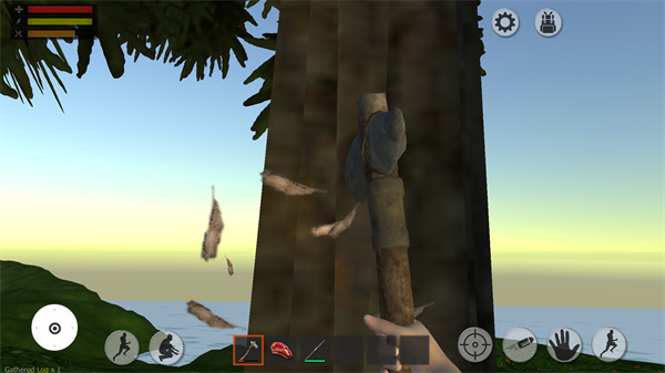 3、游戏操作十分简便:只需在物品栏中选中所需工具,再点击右侧的“手掌”按钮,即可执行劈砍、挖掘等各类动作。