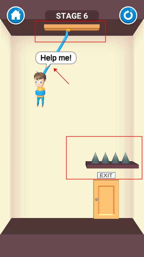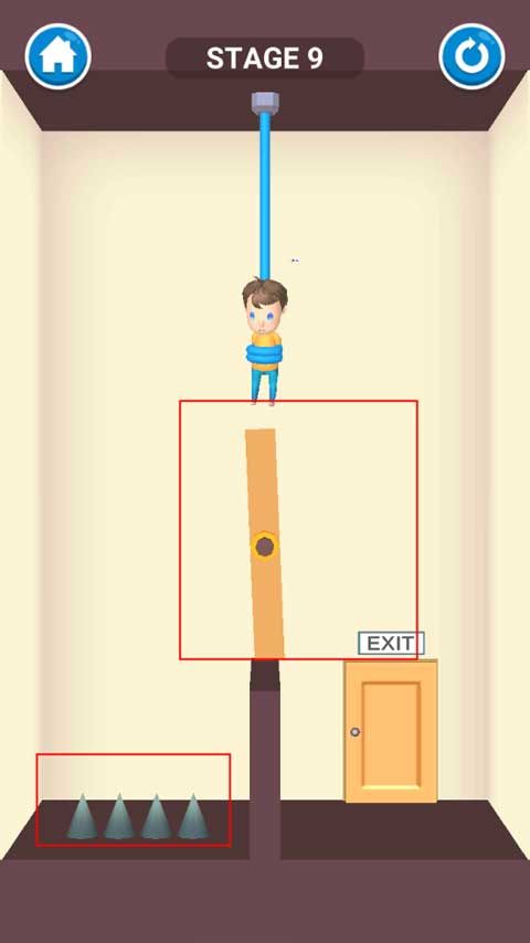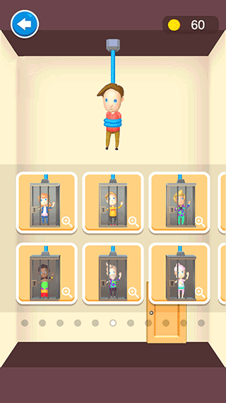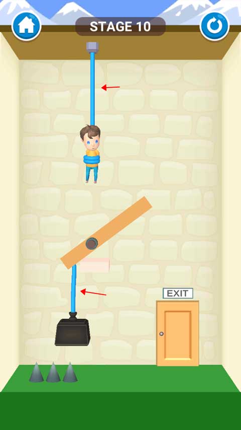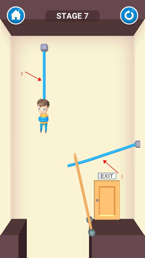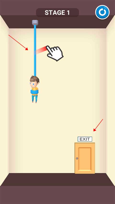 本关操作非常简单,只需用手指划断吊着小男孩的绳子即可。绳子一断,宝宝会自动走向出口,顺利过关。