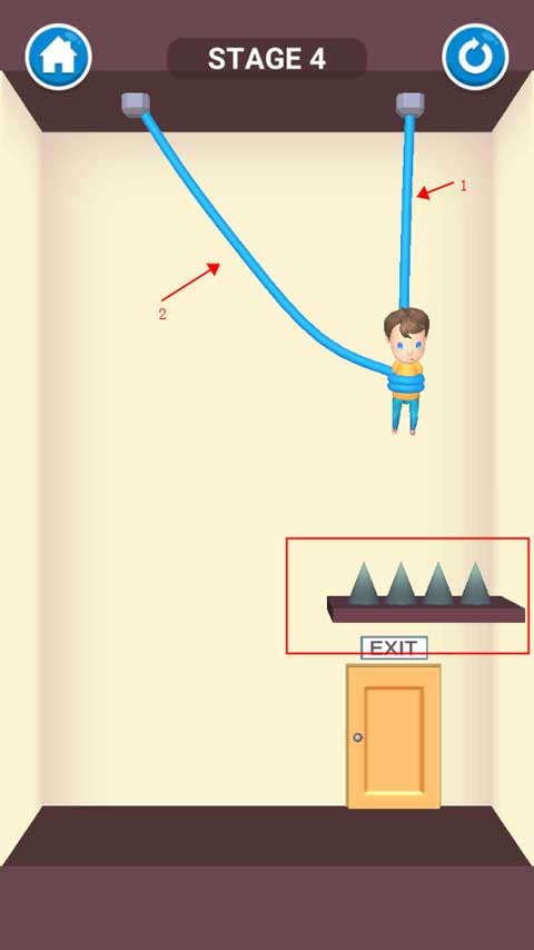 尖刺位于宝宝正下方,一旦剪错绳子,宝宝将直接坠落死亡,并失去获得金币奖励的机会。务必按照正确顺序剪绳,才能安全通关。